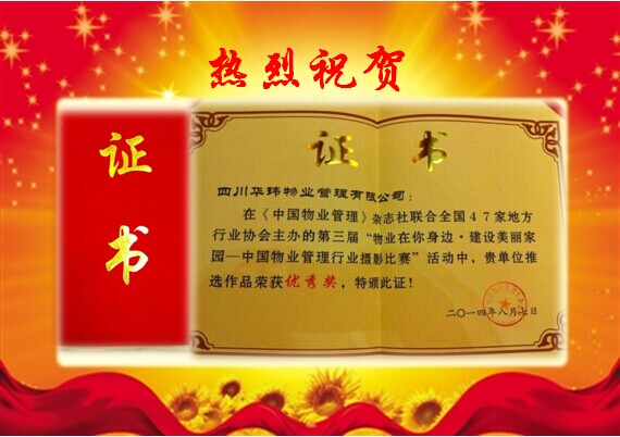 会议和论坛特邀住房和城乡建设部房地产市场监管司、中国物业管理协会领导,地方政府主管部门、行业协会领导,有关专家人士,与《中国物业管理》杂志协办单位代表,共同就“科技助推物业,品牌提升价值”进行研讨和交流。会上,在行业及地方领导讲话和杂志协办工作交流后,对第三届中国物业管理行业摄影比赛获奖作品进行了颁奖及展示。四川华玮物业管理有限公司在此次《中国物业管理》杂志社联合全国47家地方行业协会主办的第三届“物业在你身边.建设美好家园——中国物业管理行业摄影比赛”活动中表现优异,荣获“优秀奖”!